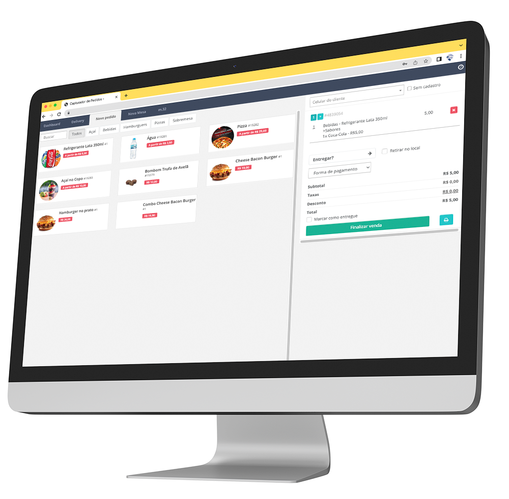 Instale nosso capturador de pedidos e aproveite o máximo, tendo notificações de status de pedidos, impressões por departamentos, avisos sonoros diferenciados para pedidos na mesa e no delivery, chamada de entregadores, impressões automática direto no departamento, origem do pedido (Facebook, Instagram, Site), atalhos de configuração rápidas de tempo e entrega, retirada, acréscimos na taxa de entrega e abertura e fechamento da loja.